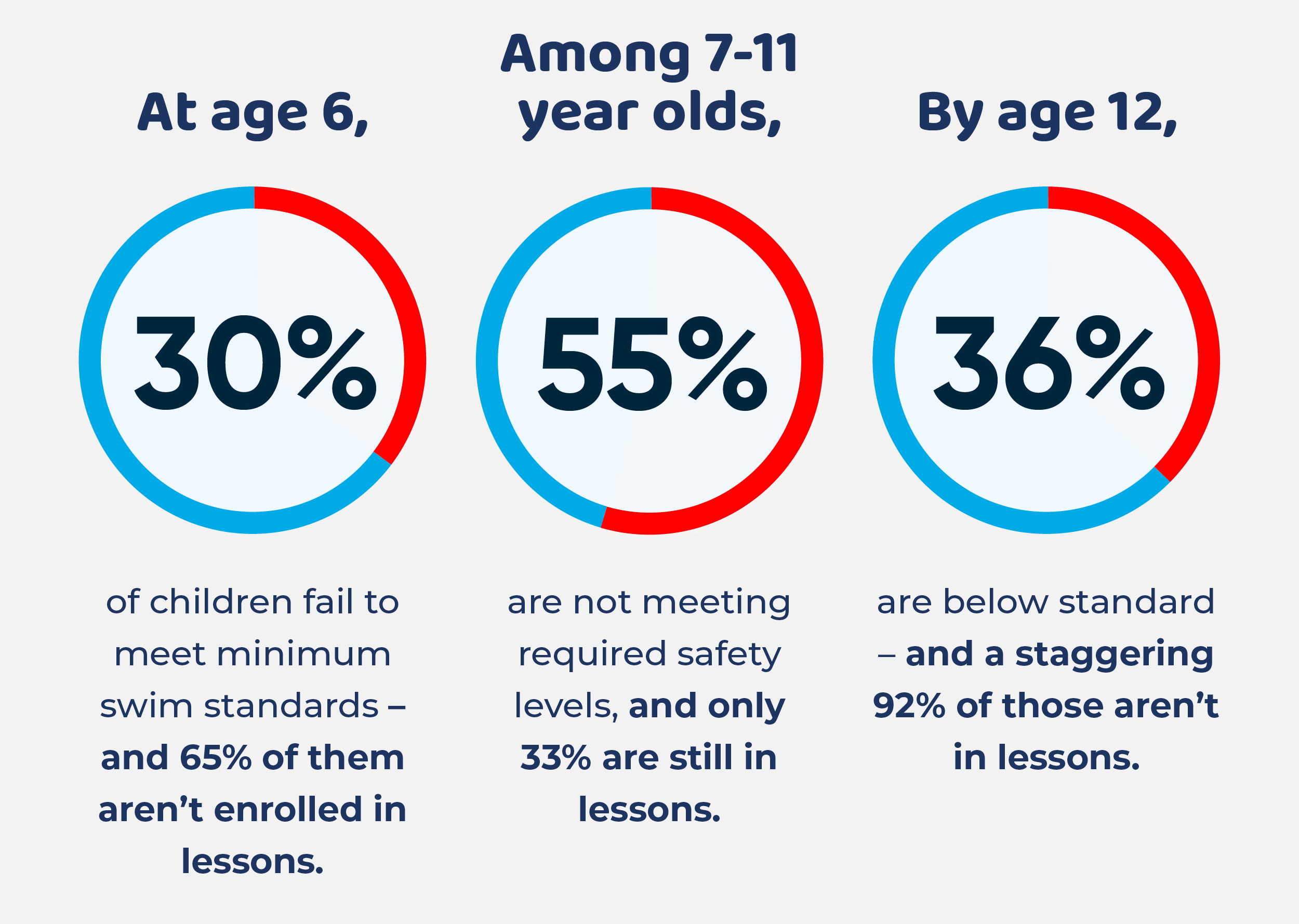 At age 6, 30% of children fail to meet minimum swim standards, and 65% of them aren’t enrolled in lessons. Then when they turn 7-11 years old, 55% of them are not meeting required safety level, and only 33% are still in lessons. By age 12, 36% are below standard and 92% are not in swimming lessons. To learn more, read our National Water Safety Report Here.